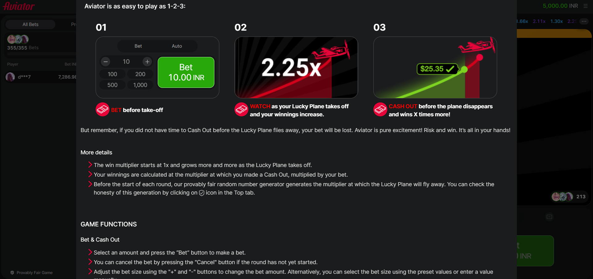 The controls are simple and easy to understand. You decide the sum you want to bet during the pause between rounds. The pause is usually 5 seconds or so. You can also make two separate bets to up your odds of getting a win. You’re usually able to bet around $1 (INR 83) to $7,000 (INR 583,583). Always check the available betting ranges before you register. They can differ from one casino to another.